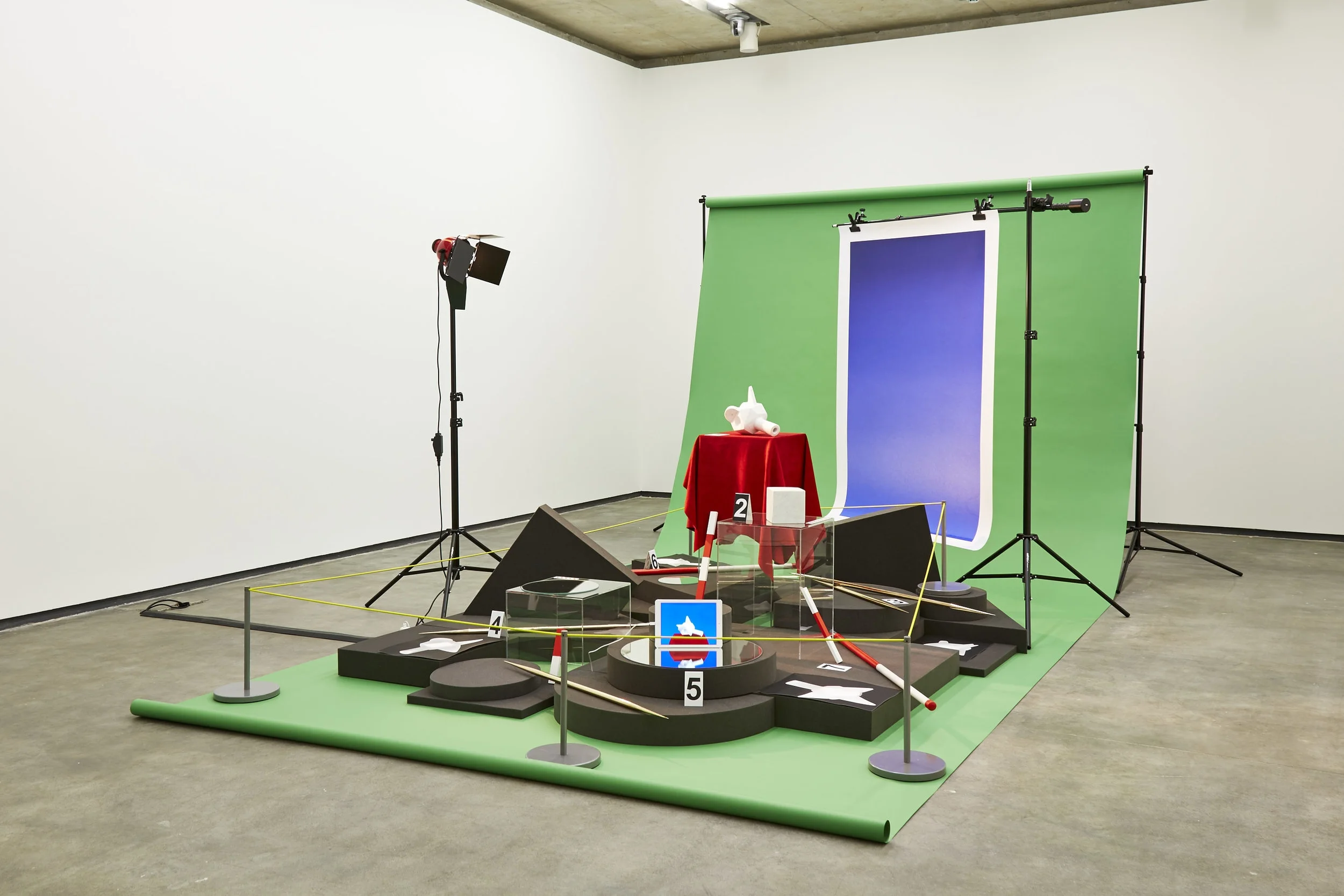 Carrara marble, split suede leather hide, clear acrylic Perspex, hand-lathed bronze bars, Chroma green photographic backdrop, photographic stands, tripods, bull clips, clamps, gloss C-type print, redhead halogen light, high impact packaging foam, wooden archeological find rulers, plastic archeological find rulers, archeological ranging poles, plastic archeological find numbers, mirrors, iPad, fibre-based photographic paper photograms, museum stanchions, yellow bungee cord, spotlight and tecton light sequence, Dulux ‘Red Stallion 2’ acrylic emulsion.